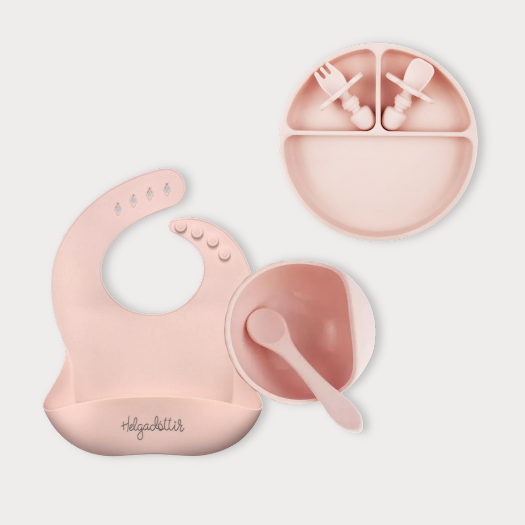 Gjafasettið kemur í fallegri öskju og innheldur, sílikon disk með sogskál, sílikon skál með sogskál, smekk með vasa, skeið og byrjenda hnífapörin okkar.