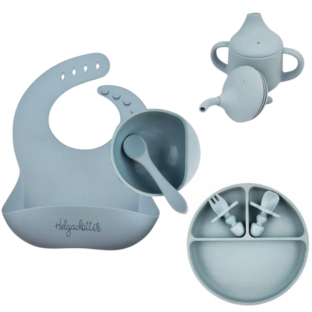 Gjafasettið kemur í fallegri öskju og innheldur, sílikon disk með sogskál, stútkönnu með 2 lokum, sílikon skál með sogskál, smekk með vasa, skeið og byrjenda hnífapörin okkar.
