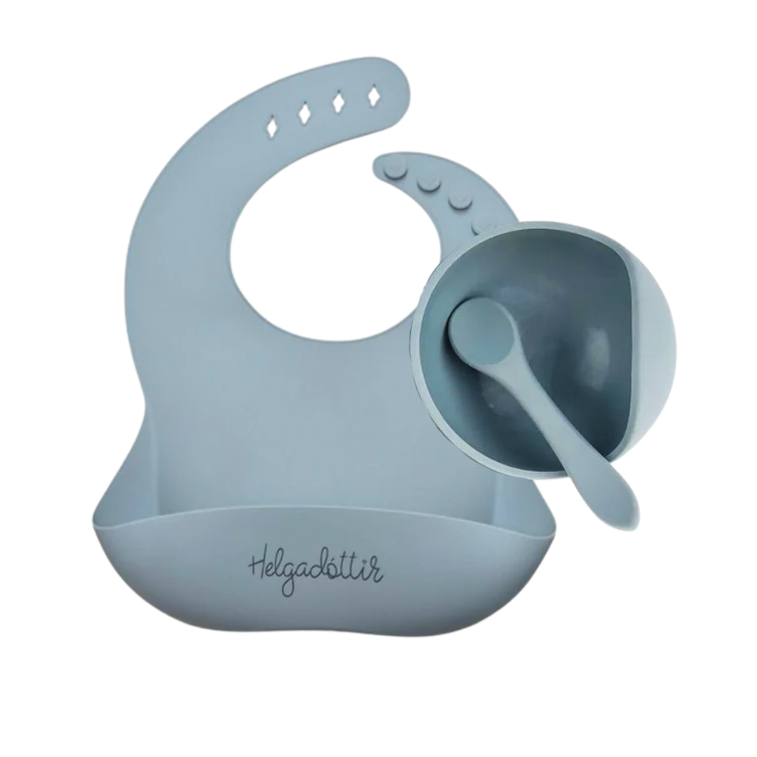 Gjafasettið kemur í fallegri öskju og innheldur, sílikon skál með sogskál, smekk með vasa og skeið.